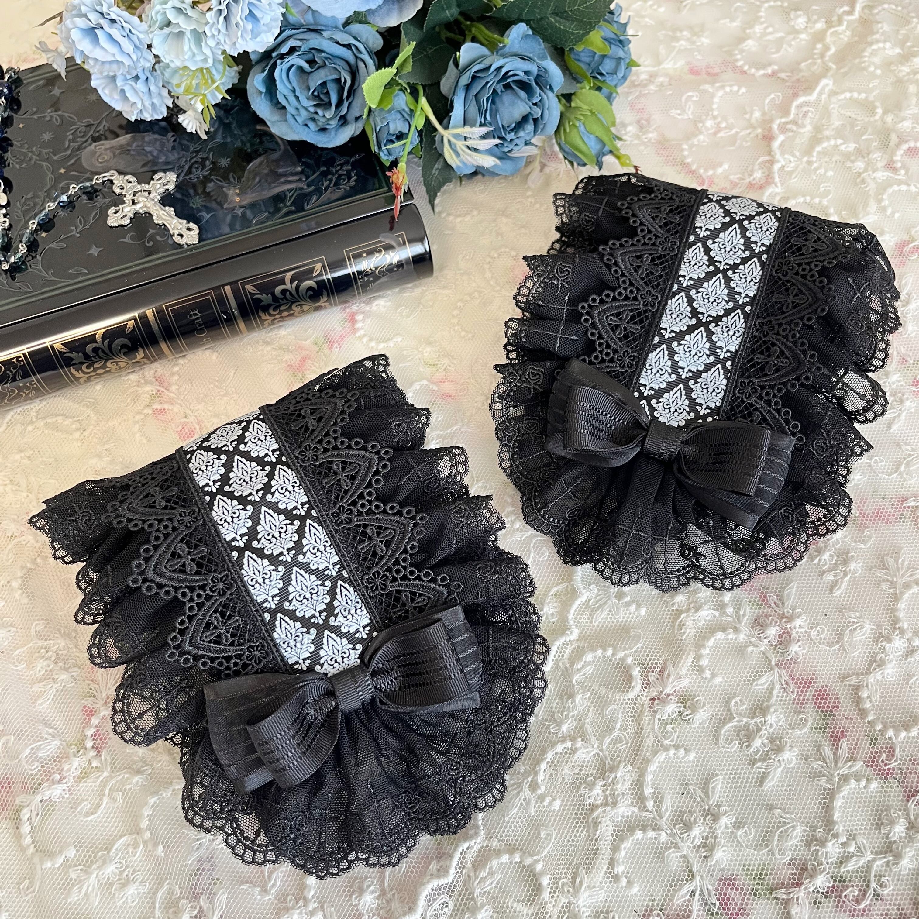 ヘッド部分のダマスク柄プリントリボンをポイントに、周りには十字架と薔薇の刺繍レース